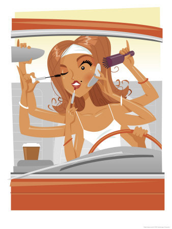 This morning on the Interstate, I looked over to my left and there was a woman in a brand new Cadillac doing 65 mph with her face up next to her rear view mirror putting on her eyeliner.