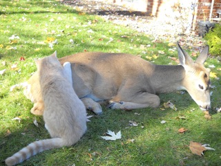 ManxMamma sent me these charming pictures of two unusual friends. The deer visits the cat every morning in a garden in Harrisburg, PA. The owner took the pictures and the story has found its way into the internet...