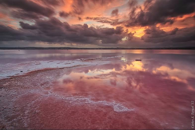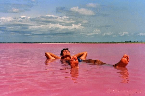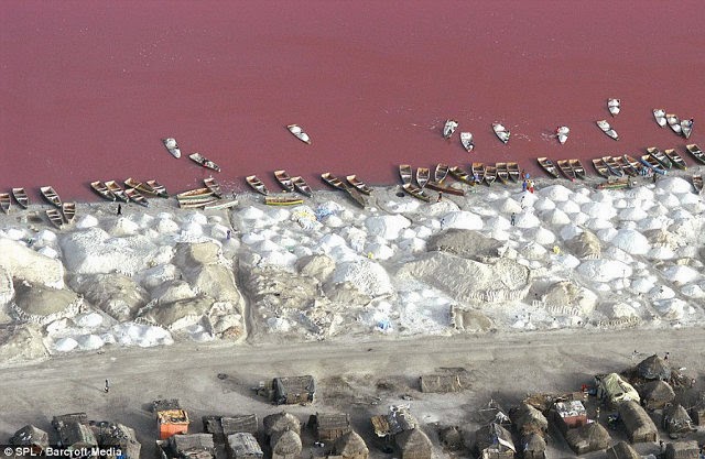 Lake Retba (or Lac Rose), in Senegal. The colour is caused by