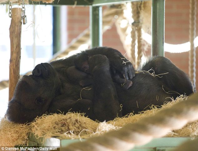 Keepers at Twycross Zoo, Warwickshire, have so far been unable to get close enough to 16-stone (224lbs) Ozala to determine the sex of the infant, born four days ago.