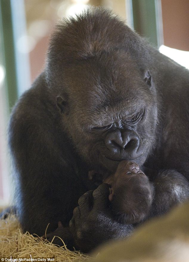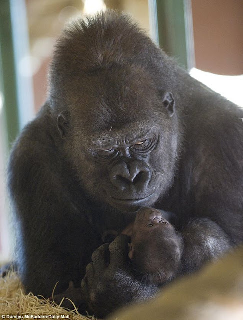 Look into her eyes as she cradles her newborn baby and you know she's not going to let anyone mess with the little ape.
