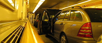 One of the nice things about travel from England is the Channel Tunnel. If you have a reservation, when you arrive at the check-in booth, some gadget reads your car number plate, your name appears on the screen, you touch the screen to confirm everything they ask and a ticket appears with the letter corresponding to your crossing (in our case it was "N"), you hang the ticket on the mirror, have a cup of coffee (or tea) and wait for your crossing to be called. When that happens, you proceed to loading area, queue for a few minutes, then drive into the train, sit there doing all the bits they ask you to do, in another few minutes the thing starts moving and half an hour later you're in France! [Reverse the process if you're going from France to England, of course.]