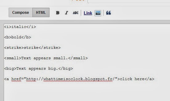 The last example is a hyperlink. If you want to make any text appear as a clickable link, all you do is write everything exactly as above, but instead of "http://whattimeisoclock.blogspost.fr/" you paste the address of the site you want to link and instead of "click here" you write what you want to appear in your comment, such as "Cool site" or anything you that takes your fancy.