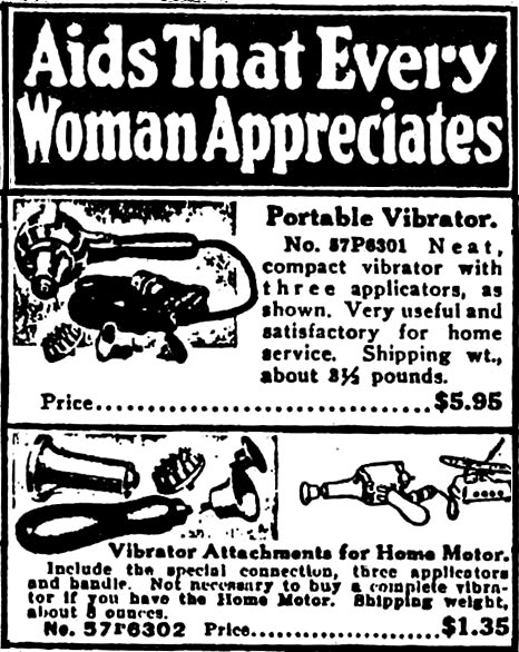 By the 20th century, the spread of home electricity brought the vibrator to the consumer market. The appeal of cheaper treatment in the privacy of one’s own home understandably made the vibrator a popular early home appliance. In fact, the electric home vibrator was on the market before many other home appliance "essentials": nine years before the electric vacuum cleaner and 10 years before the electric iron. A page from a Sears catalog of home electrical appliances from 1918 includes a portable vibrator with attachments, billed as "Very useful and satisfactory for home service."